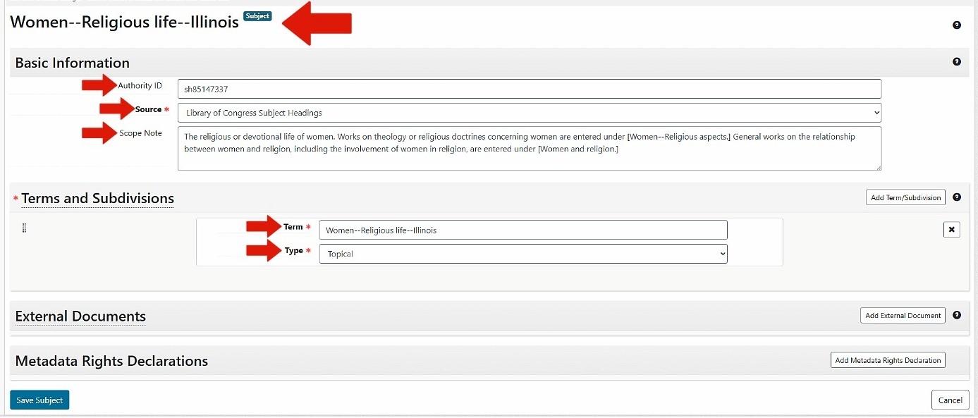 - Subjects: Begin typing, browse, or create subject. If creating a new subject, check LCSH first.